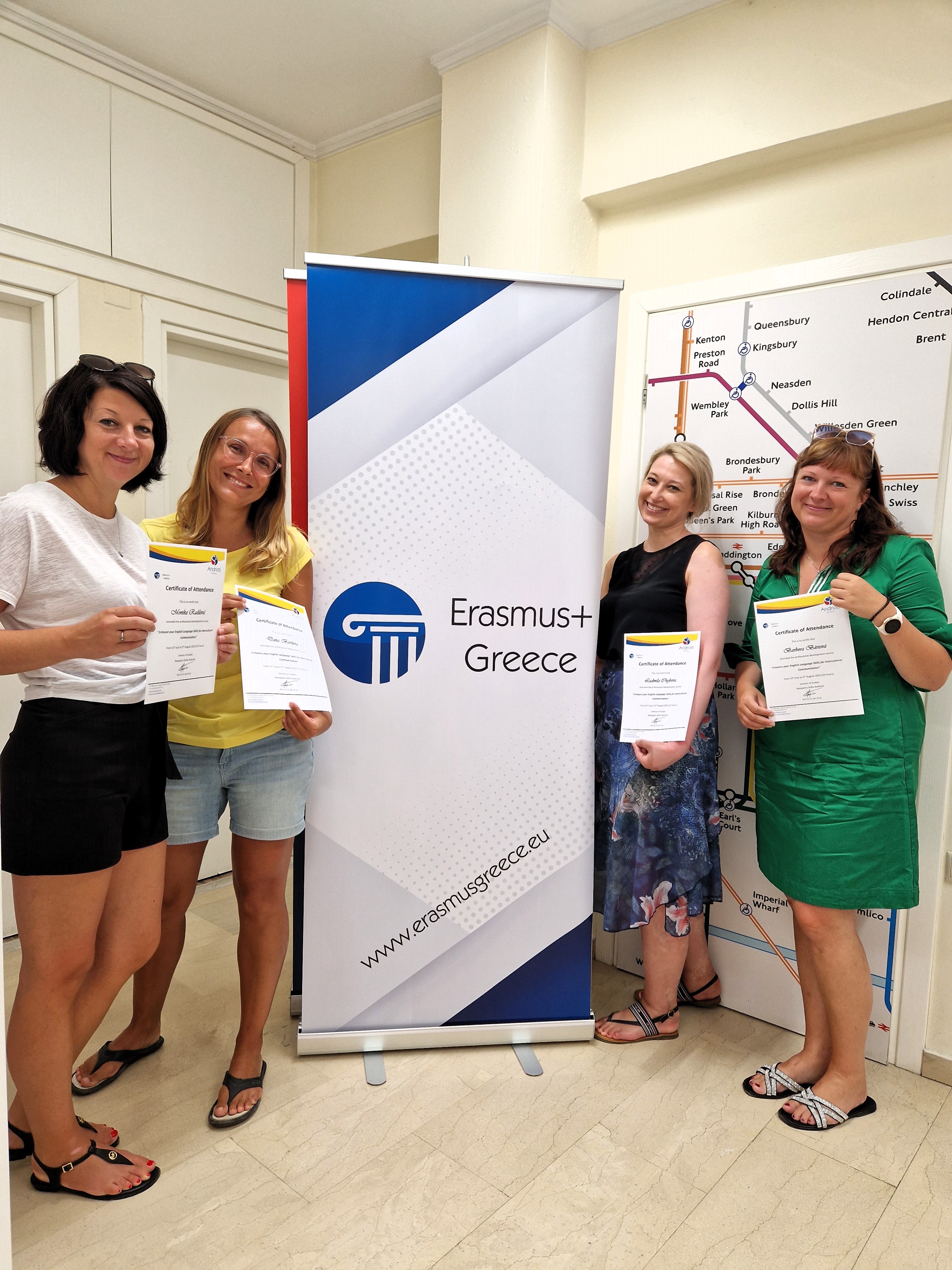 Poslední čtveřice učitelů se přihlásila na pětidenní anglický kurz na řeckém ostrově Korfu. Škola byla malá, ale útulná. Lektoři, kteří zde učili, byli milí, usměvaví a přátelští. I zde vládla velmi pozitivní energie, kterou sem vnášela během svých hodin lektorka angličtiny. Výuka neprobíhala jen ve škole, ale i v parku nebo v lázních, což může znít netradičně, ale zároveň ukazuje na život místních lidí, jejich způsob života a krásu ostrova. Kurz byl skvělý. Plnění různých úkolů, komunikace i výuka gramatiky, která byla srozumitelně a jednoduše vysvětlena. Nechyběly ani domácí úkoly. Součástí kurzu byla celodenní prohlídka hlavního města – Korfu. Zde se naši setkali s dalšími kolegy, kteří navštěvovali stejnou školu, ale absolvovali jiné kurzy. Navštívili i staré město a pevnost. Při společném obědě byla příležitost nejen ochutnat tradiční jídla, ale také se lépe poznat a vzájemně komunikovat.