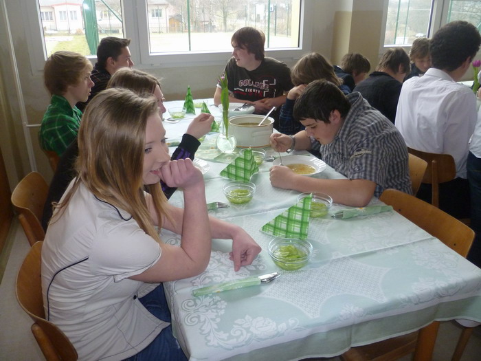 Musím moc poděkovat dětem z parlamentu a jejich rodičům za ceny do tomboly, které nám věnovali. Místo páté hodiny proběhla v tělocvičně taneční soutěž a losování tomboly. Následovalo překvapení o dvanácté. Po domluvě s kuchyní se parlamenťáci ujali role číšníků a číšnic a celý druhý stupeň byl na obědě obsloužen. Jídelna vypadala slavnostně, bylo prostřeno a nechyběla ani kytička na stole. Po obědě byla nabízena káva a dezert. Další poděkování patří p.Bloudkové, p. Hodačové a p.Zajíčkové za napečené pekáče dobrot a všem z kuchyně za pomoc s přípravou jídelny.