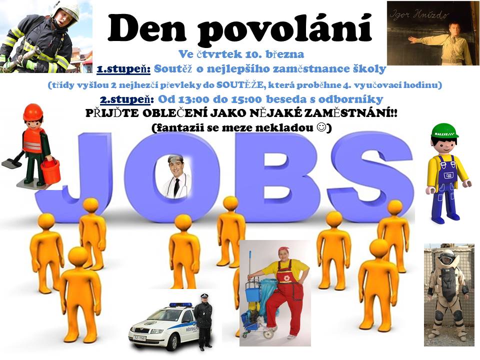 Na čtvrtek 10. března připravil žákovský parlament Den povolání. Všichni se převlíkneme za nějakou profesi. Na prvním stupni si jednotlivé třídy zvolí 2 nejhezčí či nejoriginálnější převleky a vyšlou je do soutěže. Pro nepřevlečené je připravena "příjemná" práce. Druhý stupeň čeká beseda s odborníky, zavítá mezi nás pan starosta, veterinář, policista, řemeslník lékařka, sociální pracovnice a ředitelka mateřské školy. Odborníci představí dětem své zaměstnání a odpoví dětem na dotazy. Tak tedy ve čtvrtek práci zdar!JJ