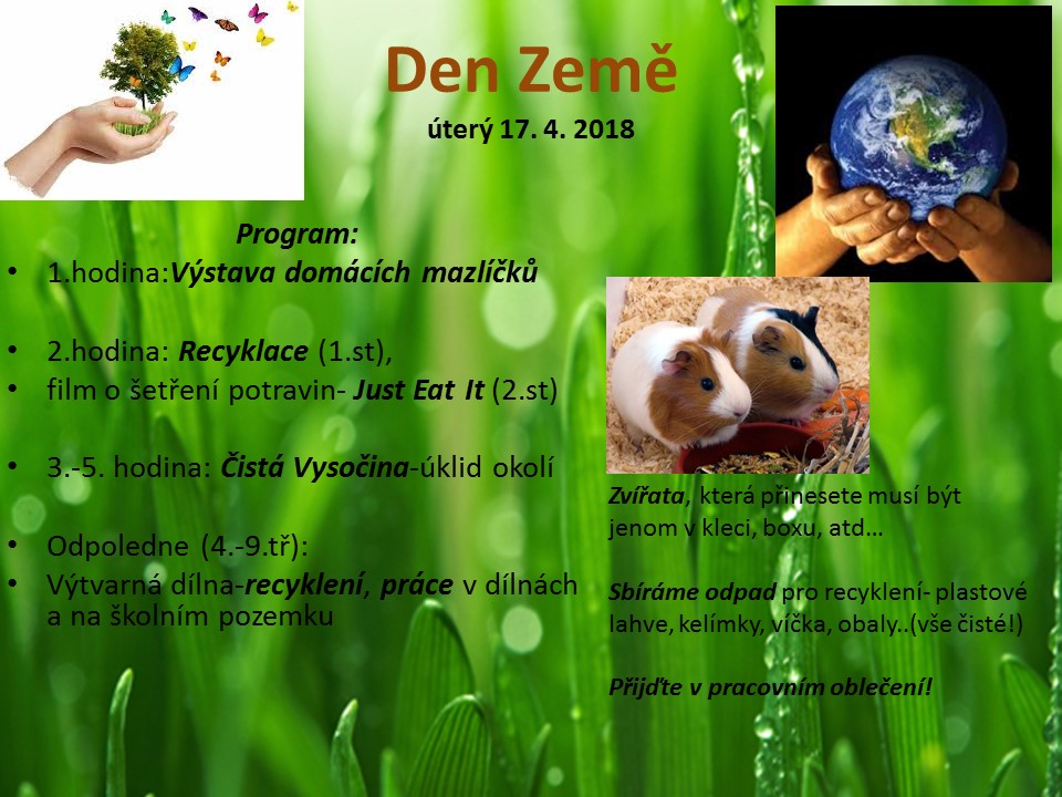 V dubnu nás čeká Den Země. Děti se mohou pochlubit svými domácími mazlíčky, dozvíme se něco o recyklaci a o šetření planety Země. Vyrazíme uklízet okolí školy a celého Želiva v rámci Čisté Vysočiny. Odpoledne proběhne vyrábění soch z plastového odpadu, postaráme se o naší krásnou zahradu a něco vyrobíme i v dílnách.